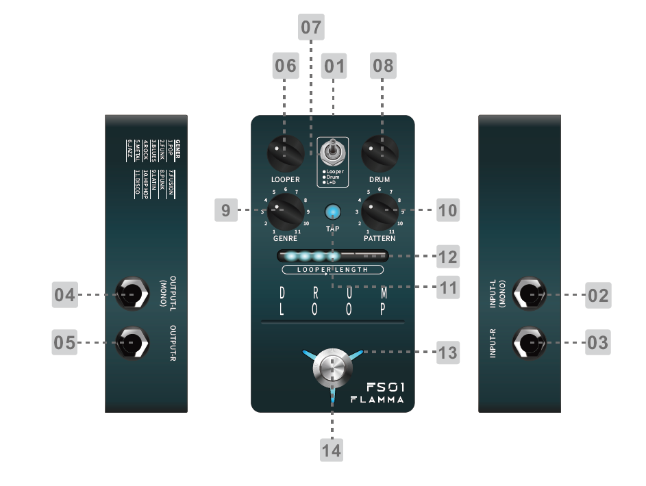 The FS01 Drum Loop pedal features a full-featured drum machine and looper with stereo outputs at an unbeatable price. The Looper provides a whopping 20 minutes of recording time and can be used independently or simultaneously with the drum machine. The FS01 also includes a visual bar indicator to accompany the looper and ensure perfectly timed loops and dubs. The drum machine features 11 different grooves styles to choose from with each groove having multiple time signature and tempo variations for a total of 121 different beats. Whether performing live or using the FS01 as a practice companion, individual looper and drum machine volume controls and stereo outputs allow you to find the perfect balance.